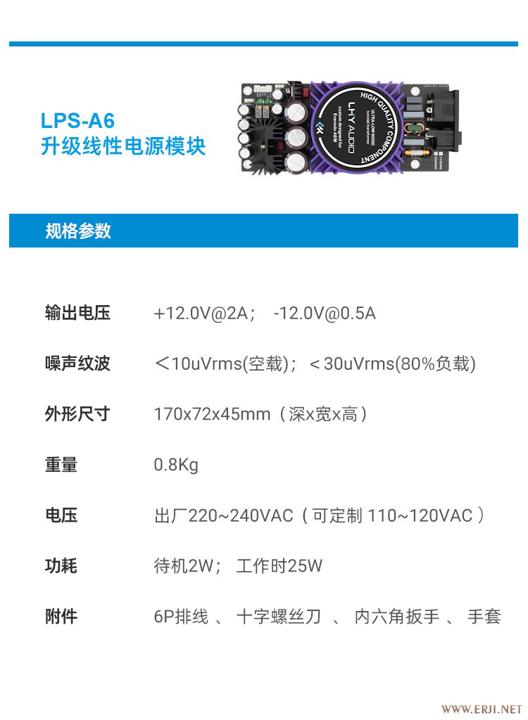 • 众所周知,玩音响就是玩电。我们这款lps-a6线电模块空载纹波<10uv,满载<30uv,比原配的开关电源模块低100倍以上。通过大幅降低电源的噪声,可以让音乐背景更宁静,细节更丰富,声音的动态和密度都有明显提升。